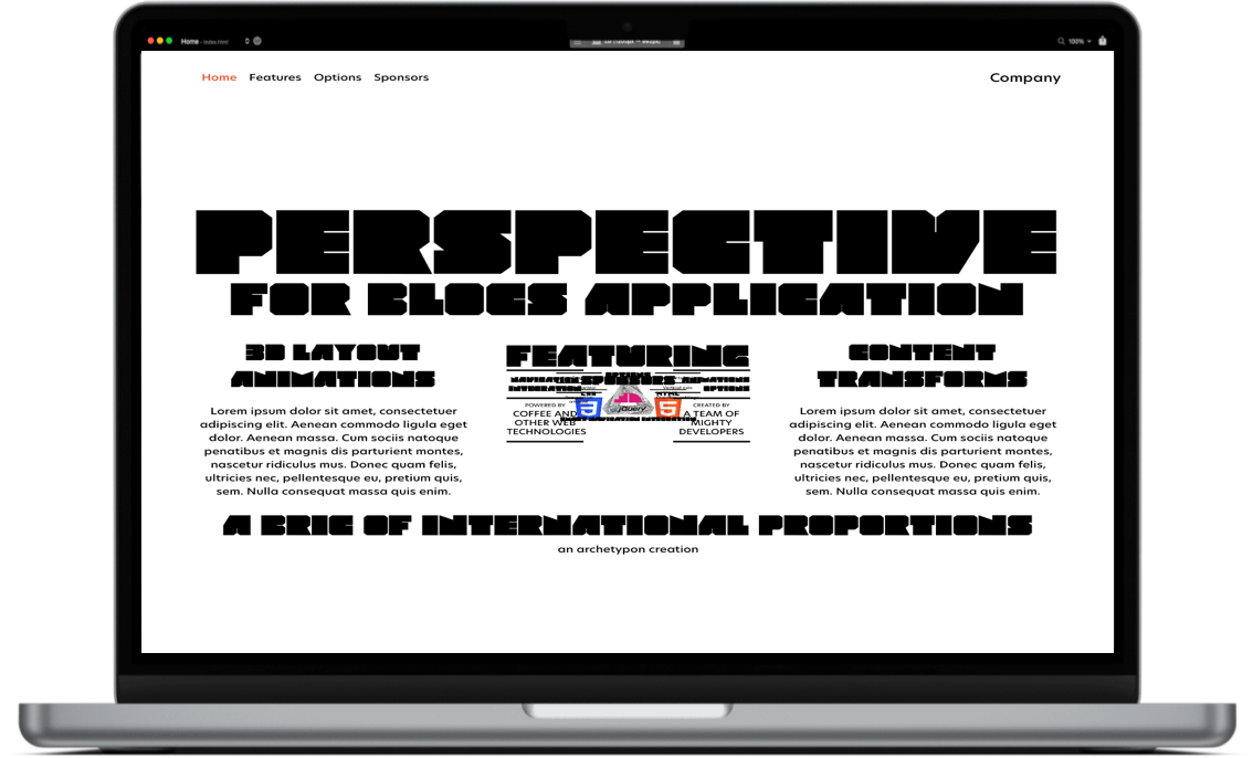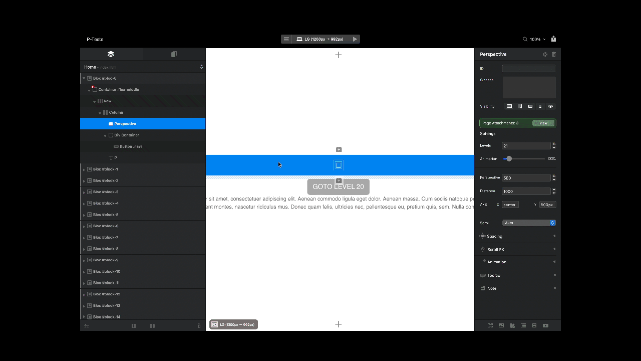 Perspective transforms the blocs elements into levels, positioning them in a 3D environment. Unlimited levels of content can be used, with controls regarding the perspective itself, the speed of the scroll animation, the distance between levels and the origin in both horizontal and vertical axis.