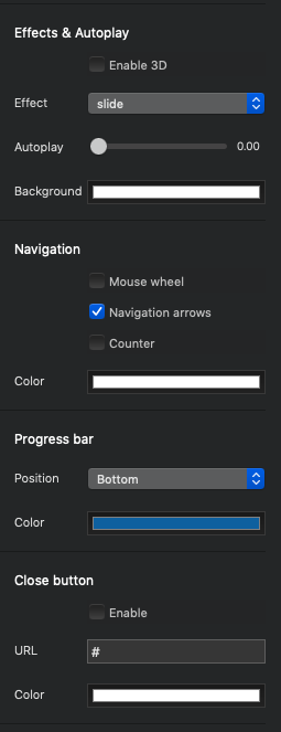 Other features include: • Close button with URL • Progress bar and counter • Caption for each image with selectable font size • Two caption positions: bottom left and centered • Link button with URL assigned to each image • Autoplay with selectable speed • Optional mouse wheel navigation • Color options for all elements