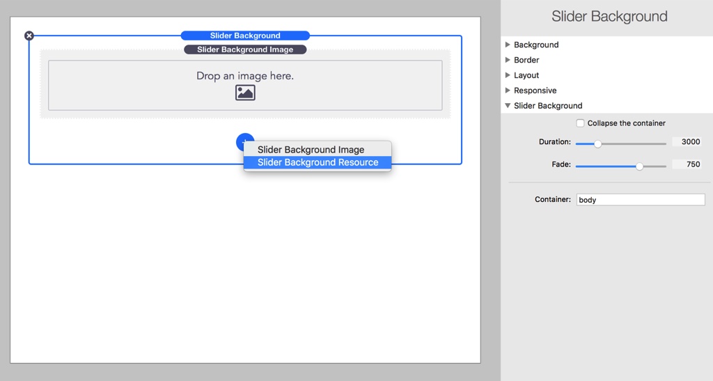 Slider Background is a stack that allows you to add a dynamically-resized, slideshow-capable background image to any page or element. We can have a single image or unlimited playing as a slideshow.