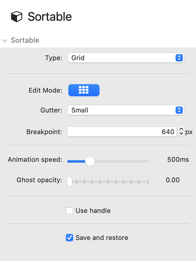 Drag and drop an element to a new location within the sortable grid, while the other items adjust to fit. This is great, if you want to sort items like gallery or menu items, for example. Grids can be of equal or custom width.