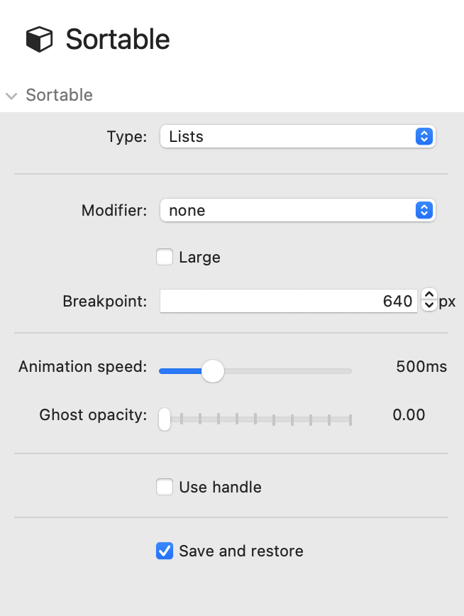 By default, the entire sortable element can be used for drag and drop sorting. To create a handle which will be used instead, just check the handle option and add the related class to a button or text.